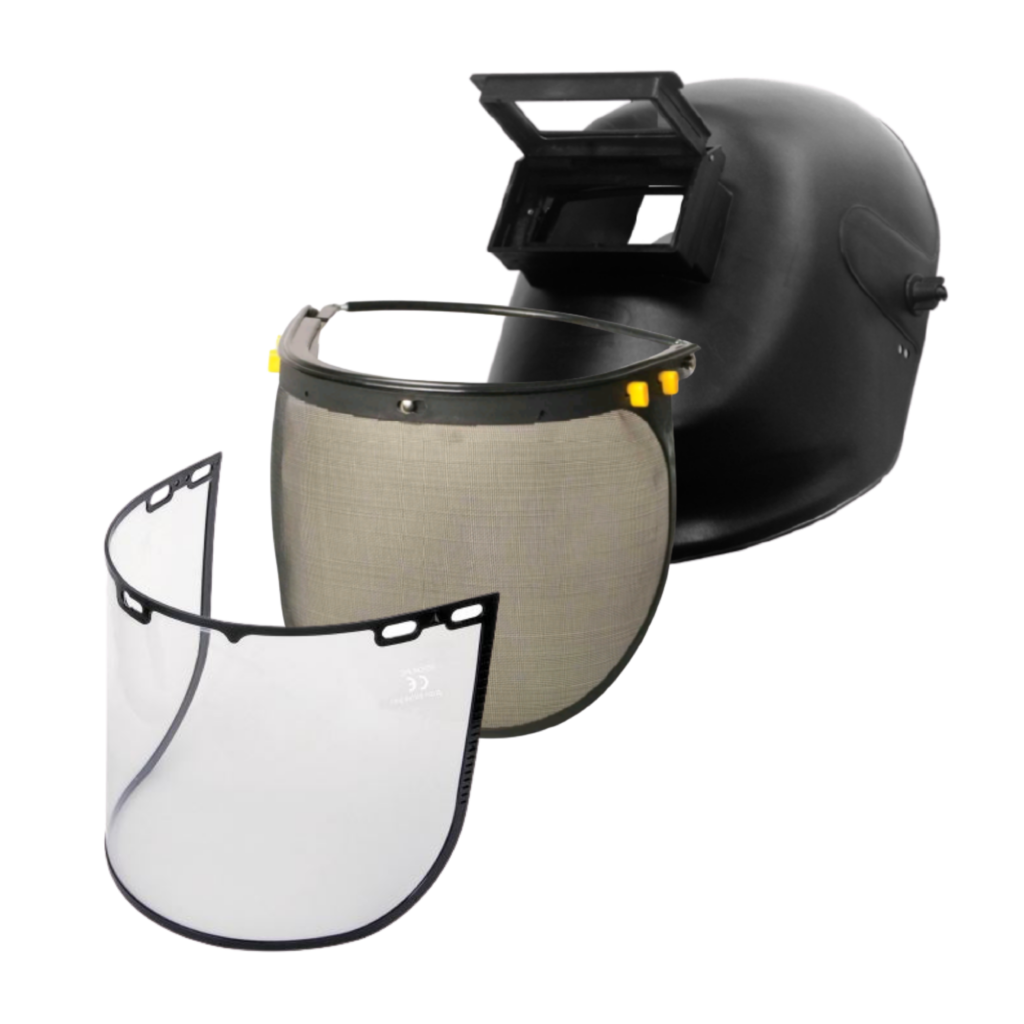 Facial em poliacrílico; Protetor de tela para acoplar em capacete; Máscara de solda.